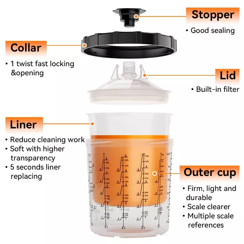 Acest sistem 1.0 de cupe de vopsea de unică folosință de 200 ml înlocuiește practic paharul tradițional cu alimentare gravitațională, deoarece nu numai că economisește mai multă vopsea, dar îmbunătățește și eficiența vopsirii. Mai exact, designul rafinat al spiralei automate în jos a căptușelii atunci când vopsirea face ca vopseaua să fie utilizată pe deplin; Între timp, designul de blocare rapidă plus înlocuirea căptușelii evită spălarea paharului, permițând efectuarea eficientă și repetă a lucrării de vopsire. Avem adaptoare pentru aproape toate mărcile de pistoale de pulverizare de pe piață pentru a satisface nevoile de experiență ale diferiților entuziaști ai pistoalelor de pulverizare. Adaptorul este fabricat din oțel inoxidabil, care este rezistent la coroziunea vopselei și foarte durabil. Combinația strânsă a căptușelii cu capacul asigură că sistemul de cupe nu curge vopsea în timpul vopsirii și sprijină depozitarea pe termen lung a vopselei nefolosite pentru a evita risipa.