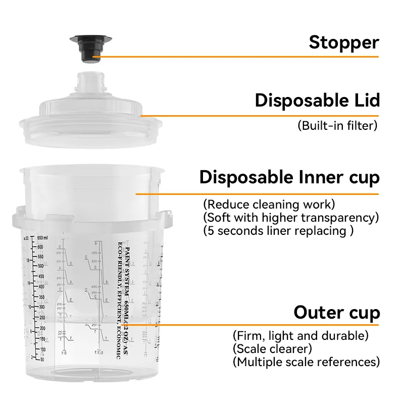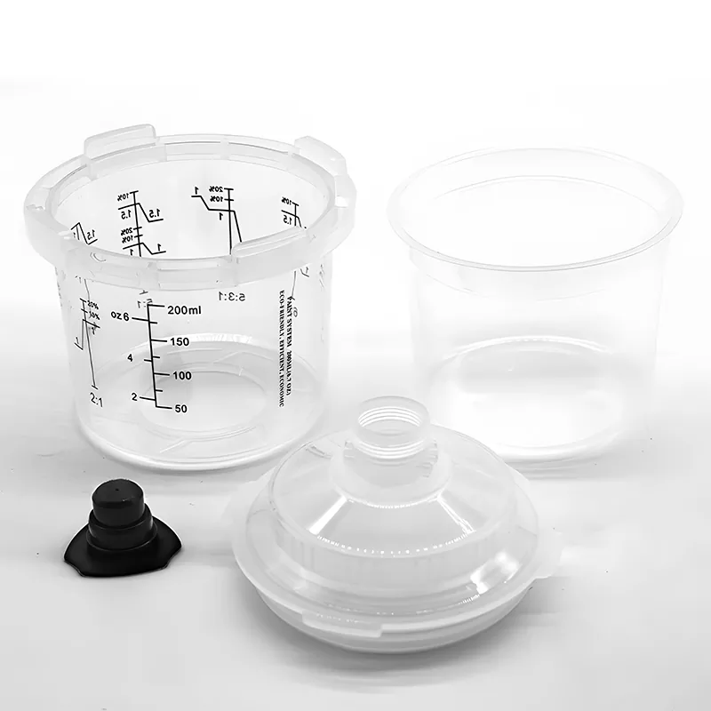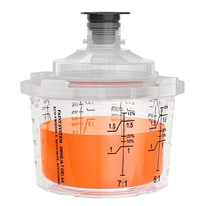 Cupa de pulverizare de unică folosință de 200 ml este un sistem de cupă de vopsea de unică folosință conceput pentru reparații cu 1 panou, este potrivit pentru zonele care necesită 6,8 FL Oz (200 ml) sau mai puțin din material. Blocarea integrată a cupei exterioare integrate nu face fără piese de guler, ceea ce facilitează asamblarea și demontarea cupei de pulverizare; Sistemul AYS3.1 Cup Paint Cup este Newst Deaind Dialable Gun Cup, care îmbunătățește semnificativ eficiența și calitatea întregului proces de amestecare, pulverizare și depozitare a vopselelor.