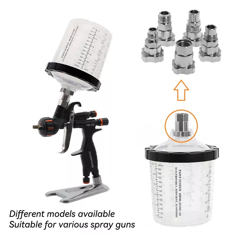 Acest sistem 1.0 de cupe pentru vopsea de unică folosință de 400 ML înlocuiește practic paharul tradițional cu alimentare gravitațională, deoarece nu numai că economisește mai multă vopsea, ci și îmbunătățește eficiența vopsirii. Mai exact, designul rafinat al spiralei automate în jos a căptușelii atunci când vopsirea face ca vopseaua să fie utilizată pe deplin; Între timp, designul de blocare rapidă plus înlocuirea căptușelii evită spălarea paharului, permițând efectuarea eficientă și repetă a lucrării de vopsire. Avem adaptoare pentru aproape toate mărcile de pistoale de pulverizare de pe piață pentru a satisface nevoile de experiență ale diferiților entuziaști ai pistoalelor de pulverizare. Adaptorul este fabricat din oțel inoxidabil, care este rezistent la coroziunea vopselei și foarte durabil. Combinația strânsă a căptușelii cu capacul asigură că sistemul de cupe nu curge vopsea în timpul vopsirii și sprijină depozitarea pe termen lung a vopselei nefolosite pentru a evita risipa.
