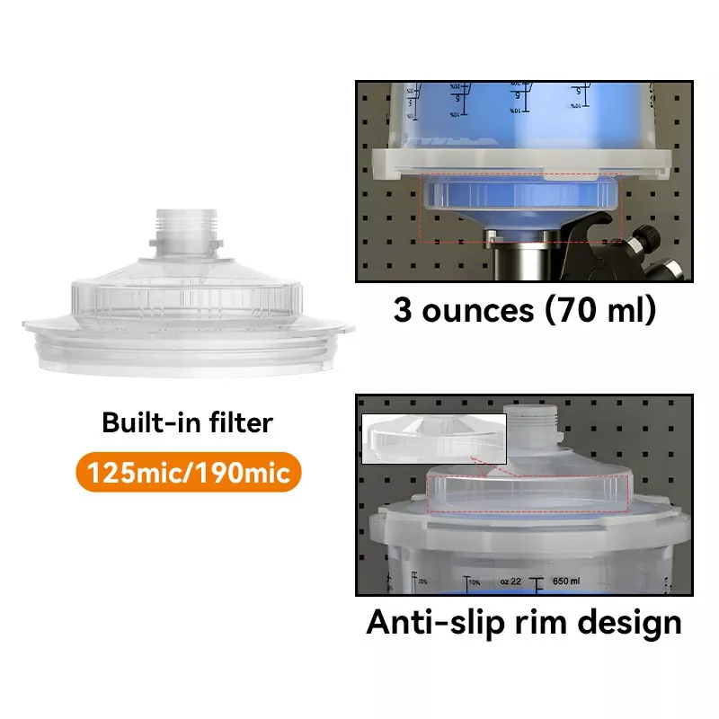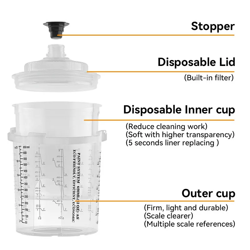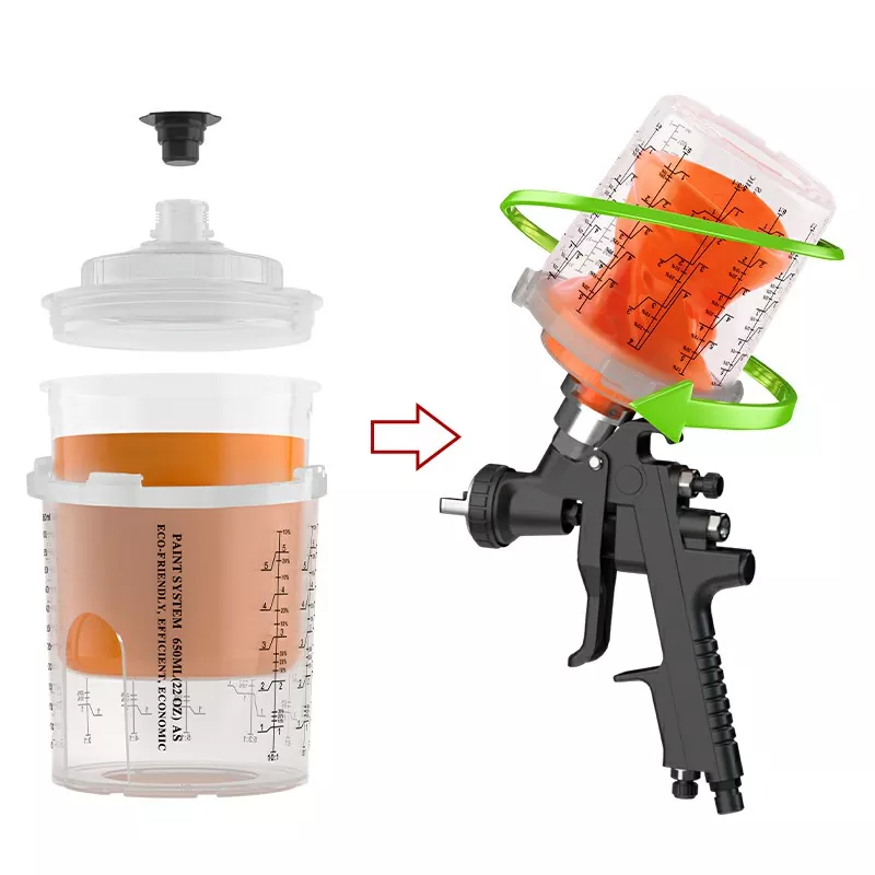Cupa de armă de spray de unică folosință de 650 ml prezintă un design integrat de prindere pe marginea cupei exterioare. Capacul se blochează pe ceașca exterioară răsucindu -l 1/4 în vârf în sensul acelor de ceasornic, reducând în continuare timpul necesar pentru a schimba cupa interioară. Acest lucru le face deosebit de potrivite pentru pulverizarea multicolor, îmbunătățind eficiența schimbării culorii vopselei. Proiectarea fără guler elimină, de asemenea, posibilitatea ca Cupa să devină inutilizabilă din cauza unui guler pierdut.