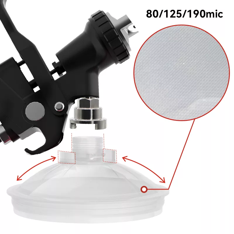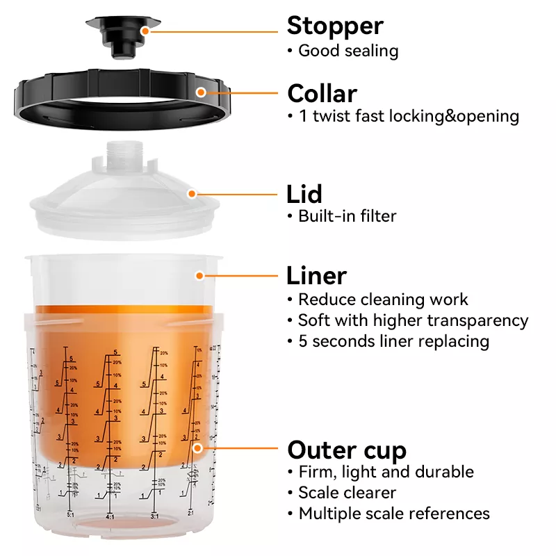 650ML Speedy Paint System 2.0 este un nou tip de sistem de cupe de vopsea spray de unică folosință. O cutie include [1 cană exterioară + 1 guler + 50 de căptușeli + 50 de capace + 20 de dopuri], care acceptă mai multe culori de vopsea într-o singură aplicare. Pentru diferite dimensiuni ale particulelor de vopsea, rețelele de filtre sunt disponibile în 80, 125 și 190 de micrometri, permițând să alegeți filtrul potrivit. Sistemul de cupe de vopsea cu pulverizare de unică folosință poate funcționa și ca unitate de amestecare și depozitare a vopselei, deci nu este nevoie să mai folosiți pâlnii de hârtie și pahare de amestecare, realizând patru funcții într-una: filtrarea, amestecarea, pulverizarea și depozitarea vopselei. Acesta este motivul pentru care pasionații de pictură iubesc atât de mult acest produs.