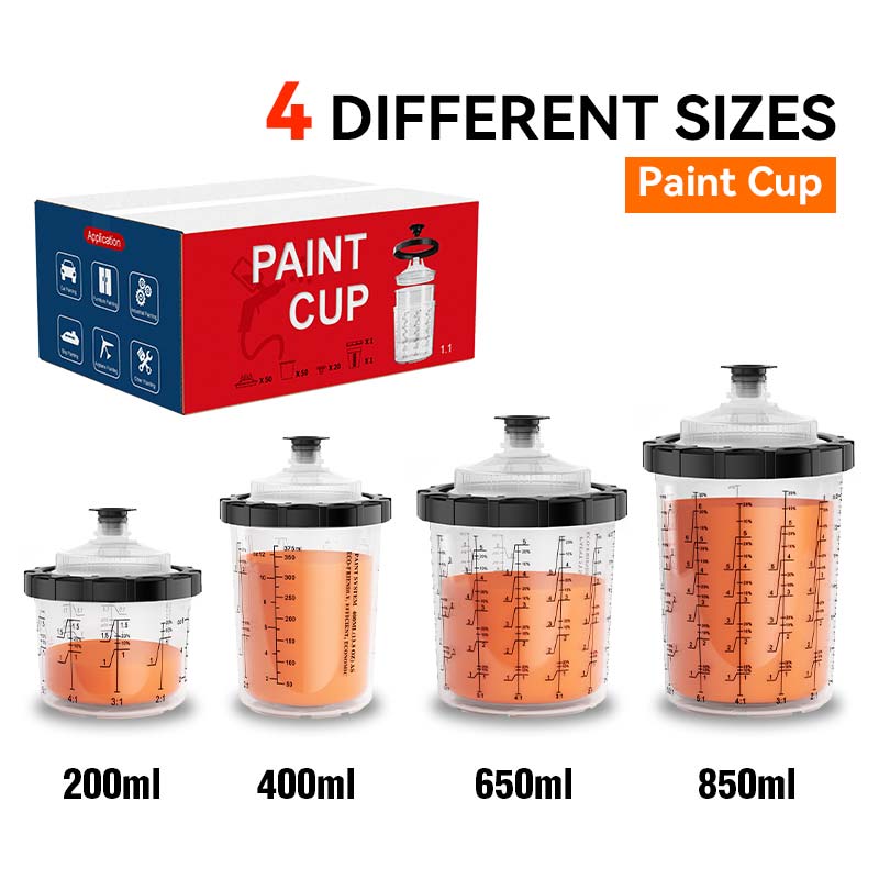 Pe baza cercetărilor de piață, Paint Cup este disponibilă în patru specificații de capacitate: 200 ml, 400ml, 650ml și 850 ml, găzduind diferite scenarii de utilizare, fie pentru pulverizare în zonă mare, fie pentru atingeri detaliate. În plus, structura cupei interioare a fost optimizată pentru a asigura fluxul de vopsea neted, reducerea blocajului și a deșeurilor.